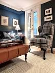 Transitional Living Room With Blue Walls, Leather Ottoman & Plaid ...
